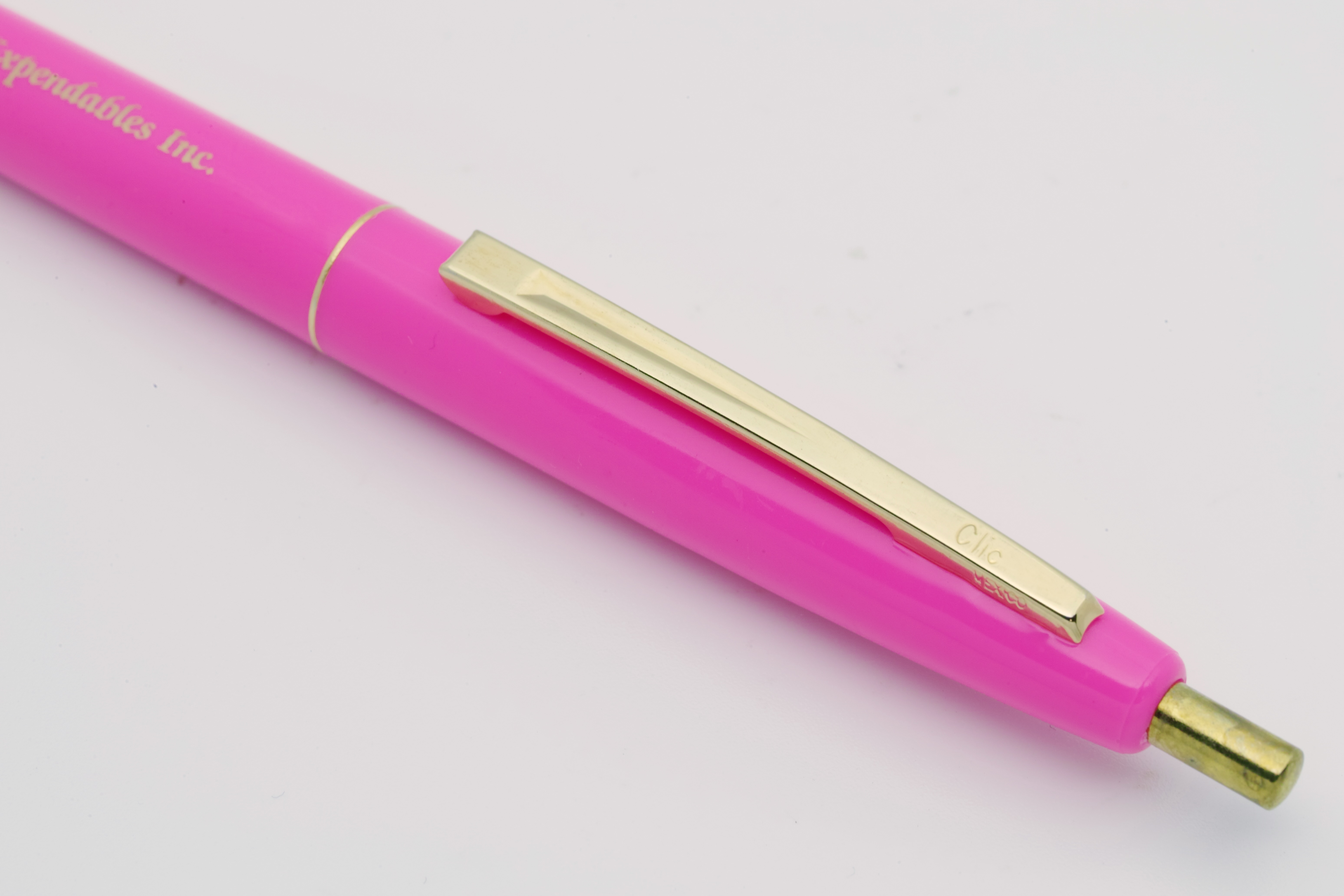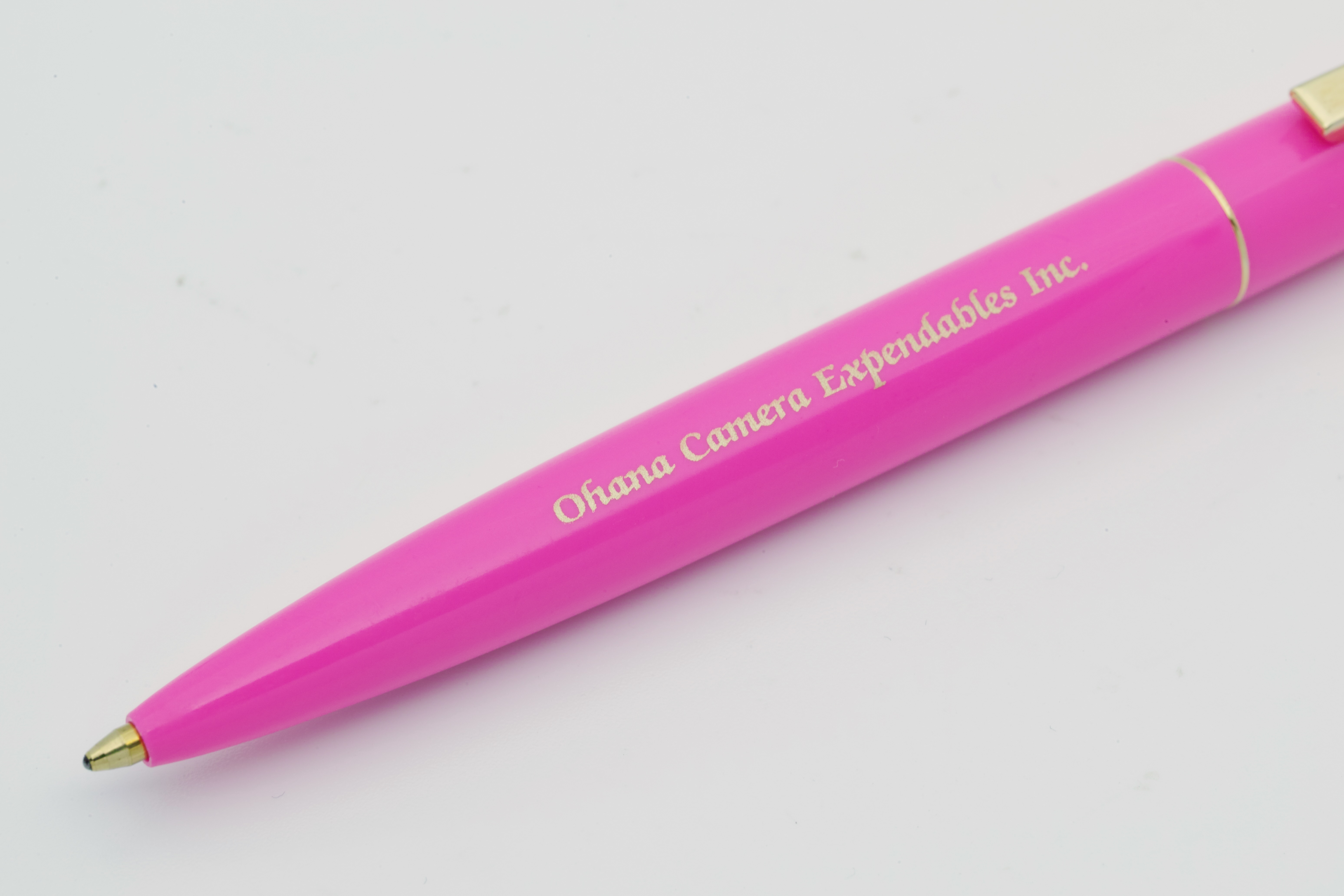 This pen features a vibrant pink plastic body with gold plated clip, plunger, and body ring. "Ohana Camera Expendables Inc." is screen printed onto the main body of the pen in a gold ink.